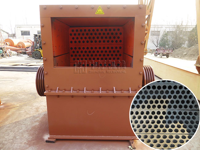方箱式破碎機(jī)工作時(shí)以電動機(jī)為動力,通過電機(jī)皮帶輪經(jīng)三角帶和槽輪帶動轉(zhuǎn)子高速運(yùn)轉(zhuǎn),物料自入料口進(jìn)入破碎腔內(nèi),在高速離心力的作用下,產(chǎn)生高速度的撞擊與高密度的粉碎,石料在互相打擊后,又會在轉(zhuǎn)盤和機(jī)殼之間形成渦流運(yùn)動而造成多次的互相打擊、摩擦、粉碎、剪切,直至粉碎成所要求的粒度。當(dāng)破碎后的物料粒度小于篩板縫隙時(shí),即從機(jī)內(nèi)下部排出機(jī)外。篩板安裝在護(hù)板與托條之間,底部為圓弧篩板,前后兩端為平板篩板。對應(yīng)減少錘頭數(shù)量及降低轉(zhuǎn)子轉(zhuǎn)速,可減少破碎物的粉末率。